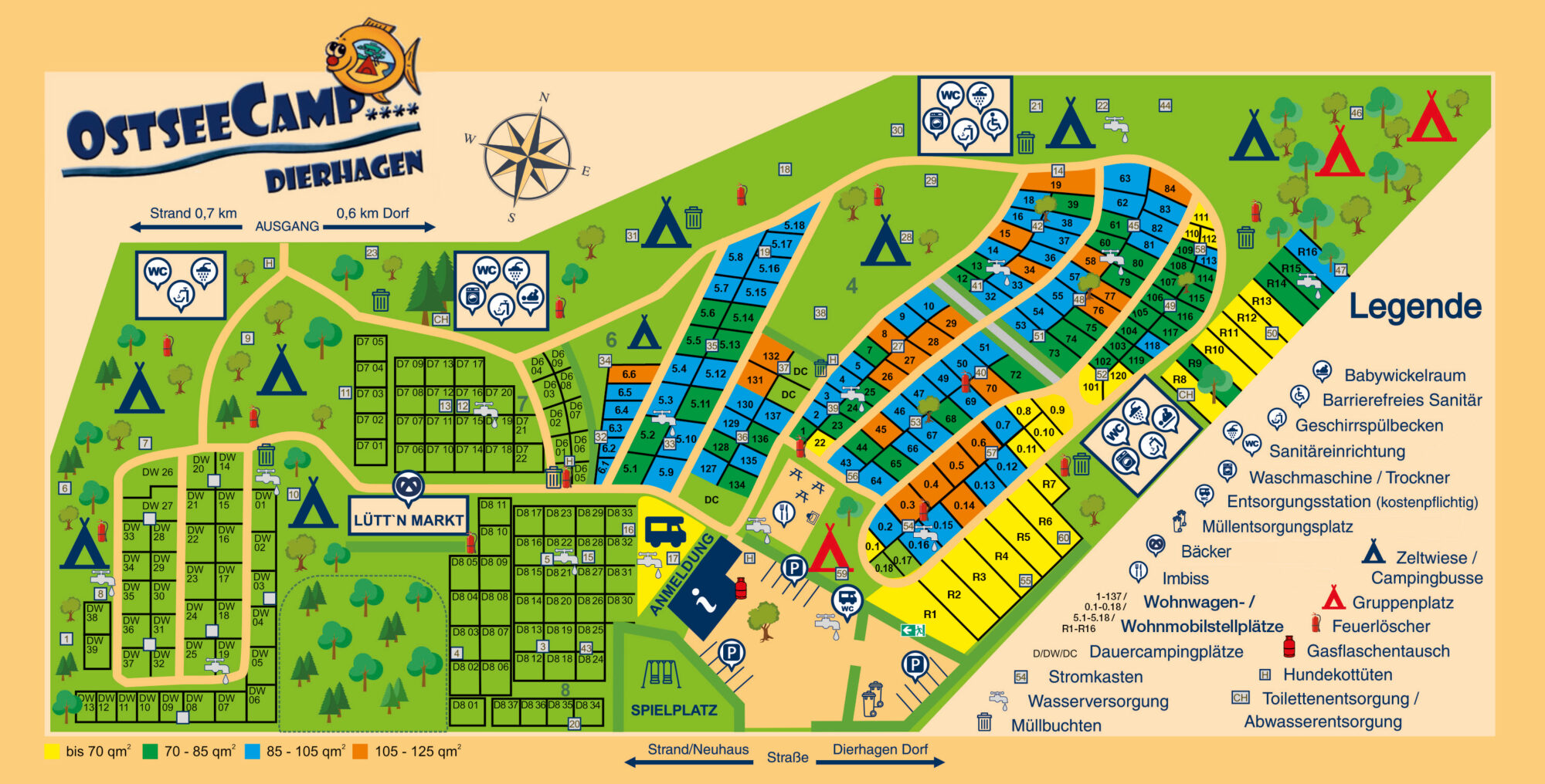 Unser OstseeCamp Dierhagen liegt am Anfang der Halbinsel Fischland-Darß-Zingst nah dem Ostseestrand (Platzplan anklicken für eine größere Version).